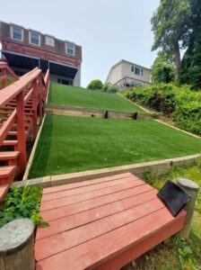 See a picture below of a current violation we are helping a client with. They paid a contractor a lot of money to clear and put down synthetic lawn on a waterfront slope. The client had no idea this was a big ‘no no.’ The contractor told them they didn’t need a permit.