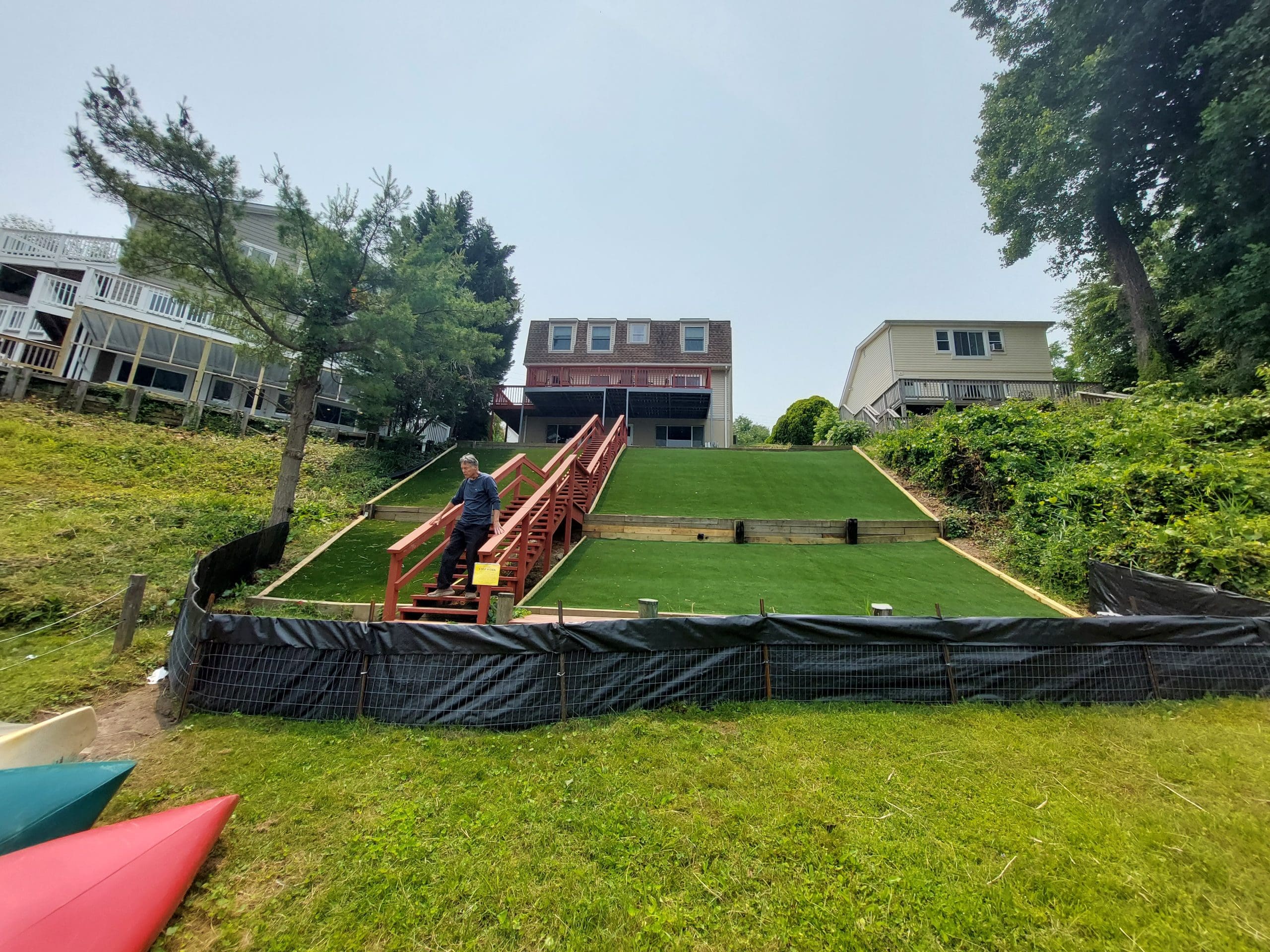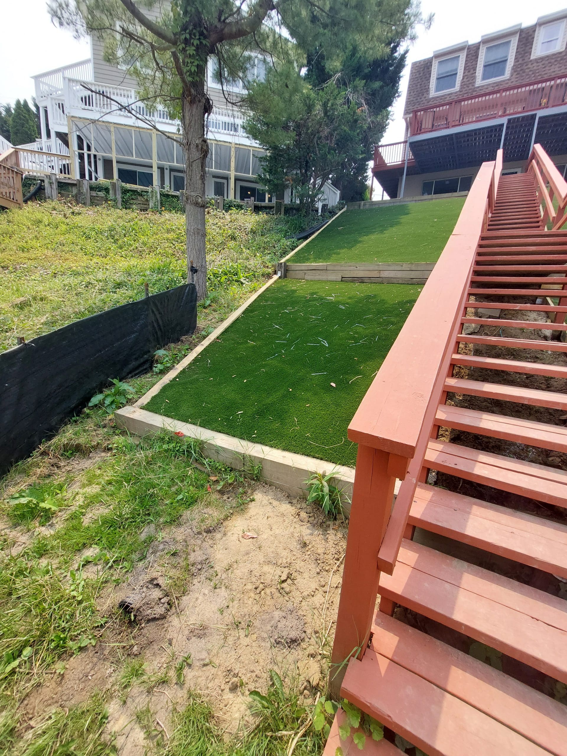 The Carrolls contacted us after getting a violation from Anne Arundel County. Another contractor had cleared their waterfront slope and installed synthetic lawn, all without a permit. The client had received a stop work order from the County and the other company could not afford to help them with the repair.