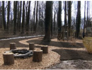 - Use tree trunks as seating and shredded branches for woodchip pathways